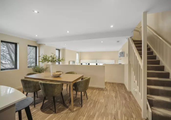 Be welcomed by a thoughtfully designed split-level lounge room that adds architectural interest, this clever layout creates a natural separation between living and dining areas, enhancing both functionality and flow. High ceilings and large windows flood the space with natural light, while the sunken lounge offers a cozy, intimate retreat perfect for relaxing or entertaining in style.