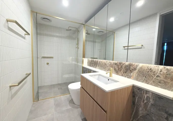• Contemporary bathroom with mirrored storage