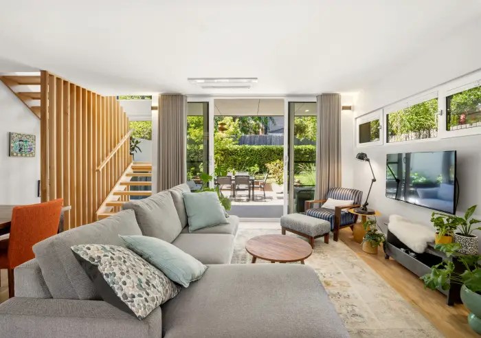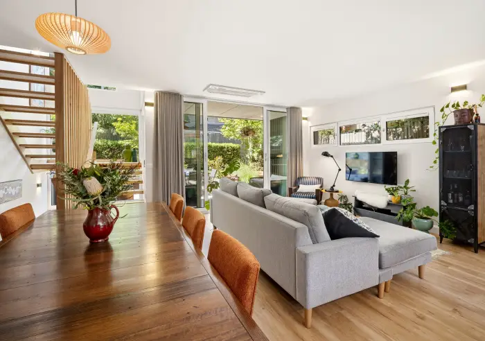 Step inside to discover a modern light-filled open-plan layout, seamlessly connecting the living, dining, and kitchen areas. The contemporary kitchen is well-appointed with Miele appliances, ample storage, and sleek finishes—ideal for both everyday living and entertaining.